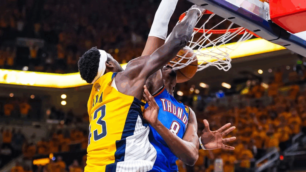 O Indiana Pacers mostrou sua força e venceu o Oklahoma City Thunder por 108 a 91 na sexta partida da série das Finais da NBA, realizada nesta quinta-feira (19), no Gainbridge Fieldhouse. Em uma noite de grande atuação coletiva, com destaque para Andrew Nembhard e Pascal Siakam, o Indy salvou a decisão, evitou o título do OKC e forçou o sétimo e último jogo para definir o campeão da liga norte-americana de basquete. A decisiva partida acontecerá no domingo (22), no Paycom Center, em Oklahoma, às 21h (de Brasília).